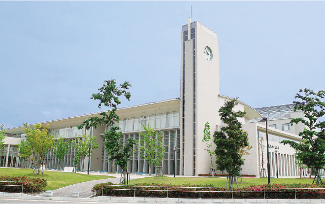 3階建ての講義棟。大・中講義室、情報実習室、教育・学術情報センター図書室があります。琵琶湖が一望できる学生ラウンジ、食堂と購買、医務室やカウンセリングルーム、事務室もこの建物の中にあります。