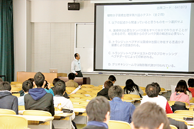 マイク設備やプロジェクターを設置して講義に活用しています。大講義室にはテレビモニターが設置されており、スライドシートを見ることができます。