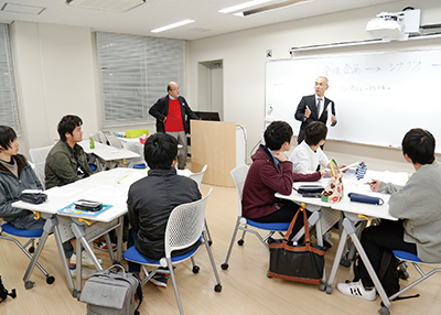 長浜市街地にある「サテライトオフィス」は、歴史ある町家を改修した共同オフィス「BIWAKO PICNIC BASE」内に併設されています。長浜駅から近く、年間約300万人の観光客が訪れる観光地黒壁スクエアへつながる北国街道沿いに位置しています。学生であれば誰でも使用することができ、クラブ活動のミーティングや研究室での自主勉強などの利用も可能です。サテライトオフィスは大学と地域との交流拠点としてHUBの役割を担っており、学生が主催するイベントの会場や、地域の方々と協力して進めるキャリア科目の教室としても利用されています。