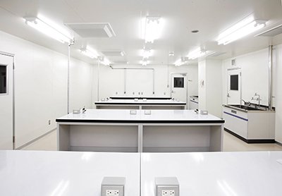 実験動物を飼育する水槽室と、無菌的なクリーンルームの中にマウス室やウサギ・ラット室があります。