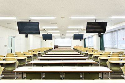 80名から150名程度収容の講義室で、プロジェクターやテレビモニター等を備えて講義に活用しています。