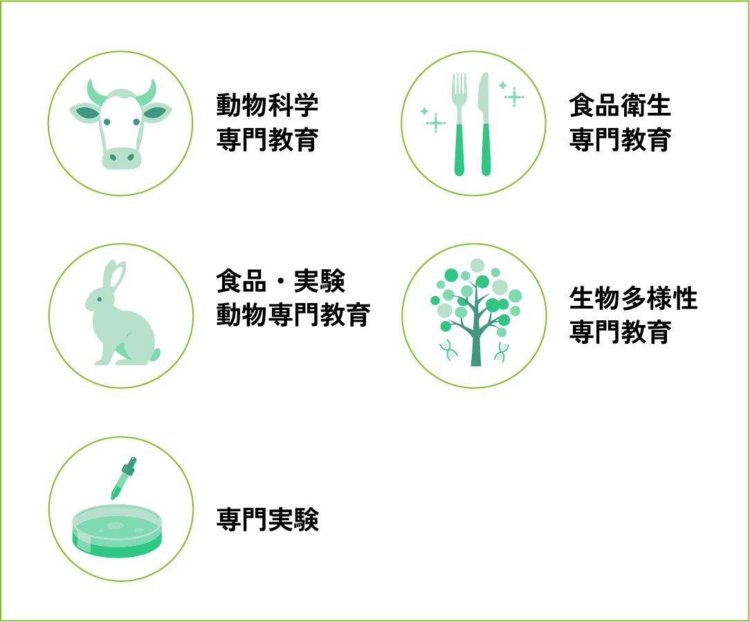 食品、医薬、畜産、愛玩動物、環境保全などの産業で活躍できる人材を育成します。医薬品の開発に欠かせず、業界からのニーズが高い実験動物技術者の資格取得も可能です。食品衛生課程を履修、修了すれば、卒業時に食品衛生管理者の国家資格が取得できます。