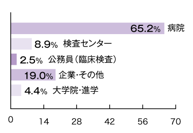 臨床検査技師の資格を生かせる職場は、病院をはじめとして、病床を持たないクリニックや健診(検診)センター、高度で特殊な検査を含め検体検査を専門に行う臨床検査センター、医療関係の研究施設など、多岐にわたります。また、臨床研究コーディネーターや製薬メーカーなどの企業、保健所などにも活躍の場があります。