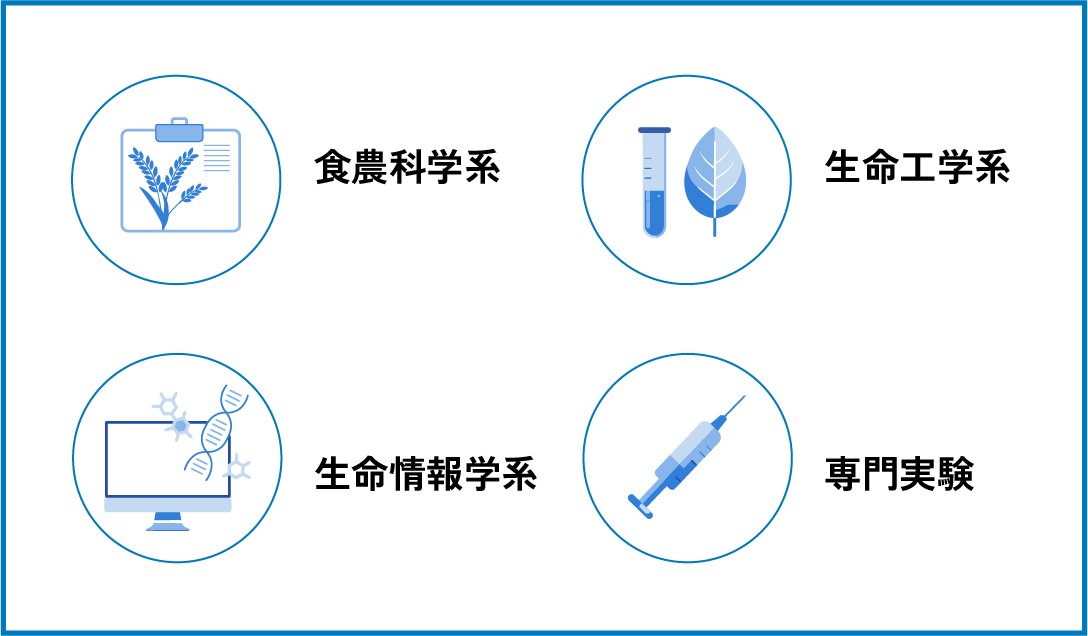 フロンティアバイオサイエンス学科のカリキュラムでは、最先端の学びをバランスよく配置しています。生命科学の基本から実践に至る知識と技術を修得し、バイオ産業をはじめ、食品、農業、環境保全、化学工業、医療、ITなど幅広い分野で活躍できる人材の育成をめざします。