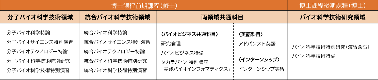 生命現象を統合的に理解するために、生命機能を司る生体分子をバイオサイエンスの技術を用いて改変し、新しい機能を持つ生体分子を創出する技術や、高度に分化した細胞の機能を細胞工学と微細構造解析を用いて解析する技術、また情報伝達や免疫機構を動植物の個体レベルで研究する技術、環境における生物の多様な生態系をさまざまな研究手法で解析する技術と共に、外国語によるコミュニケーション技術や生命倫理・科学者倫理に関しての教育を行います。