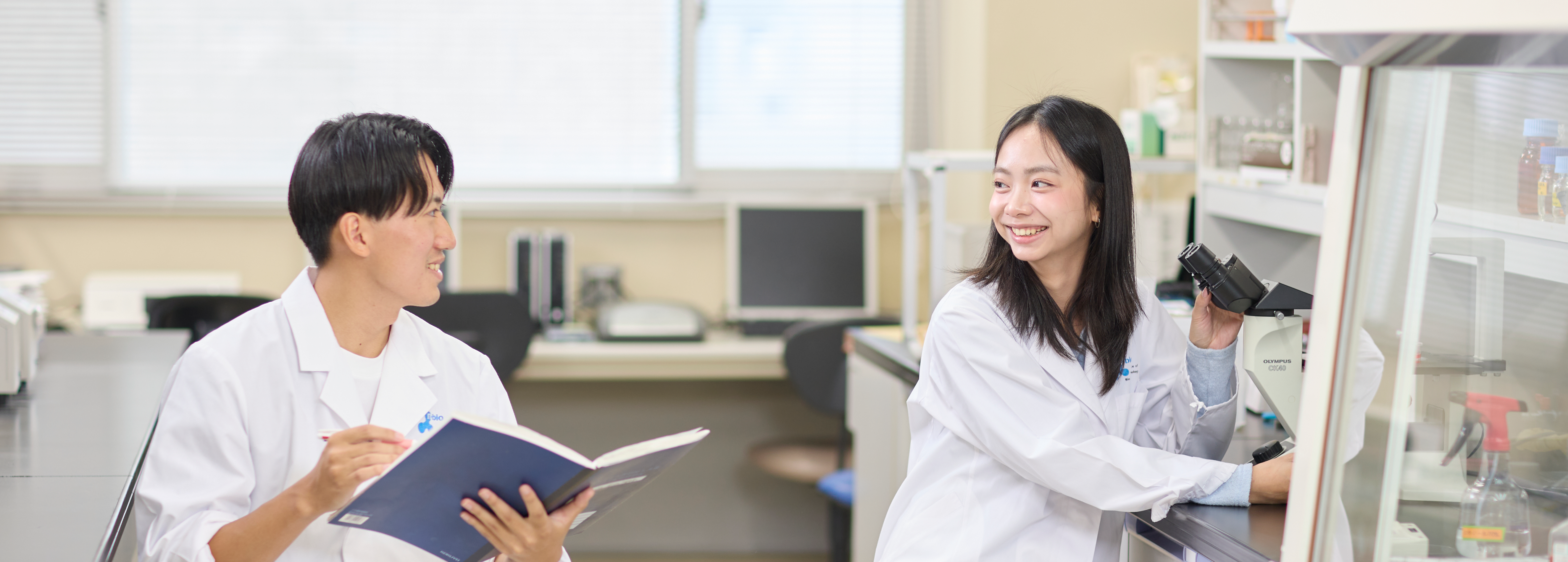 本学は小さな大学ですが、3学科すべてが生化学に特化しており、他大学に比べてバイオ分野の教員数が圧倒的に多いといえます。また、研究を進めるうえで、「あれが足りない」「これがほしい」と機器に困ったことがなく、学びの環境としても十分整備されています。 私は現在、微生物が持つ未知の遺伝子の働きを解析しようとしています。具体的には微生物の免疫機構に関わる遺伝子を特定し、遺伝子操作によってその機能を調べています。この研究が将来、遺伝子工学の発展に寄与することを願っています。