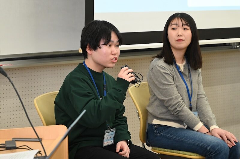 全体プログラムでは、大学紹介に続き、先輩学生による「大学生活と学びの紹介」を実施。 学生のリアルな日常についての話を通して、参加者の皆さまも入学後のイメージを膨らませている様子でした。