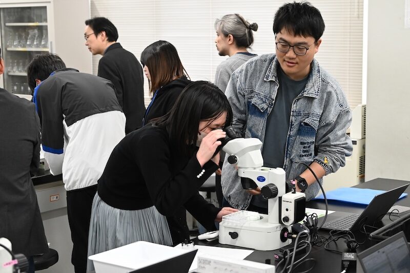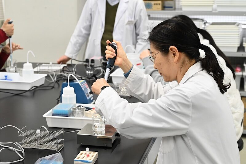 参加者の皆さまは、大学で学ぶ実験操作を、先輩学生のサポートのもと体験しながら、 大学での学びがどのように進んでいくのかについて理解を深めている様子でした。