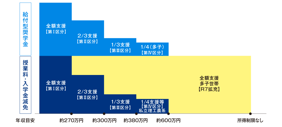 世帯収入に応じた4段階の基準で「給付型奨学金の支給」と「入学金・授業料の減免」2つの支援が受けられます。新たに創設された第Ⅳ区分では、3人以上扶養する子どもがいる世帯、または私立の理工農系分野に進学する世帯が支援対象となります。本学は全ての学科が私立理工農系の対象機関としても認定されています。