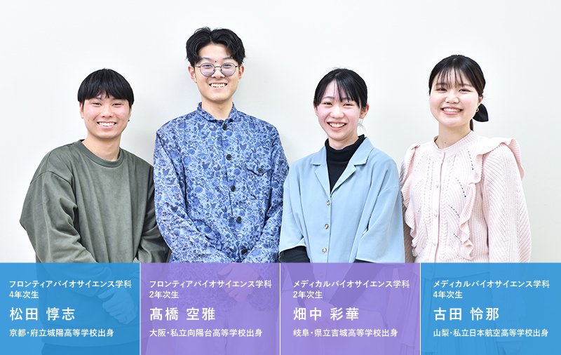 畑中: 私の場合、入学と同時に一人暮らしも始めたので、家に帰っても一人、学校でも一人みたいな状況になったらどうしようと不安で...。それがぴあサポで解消できたのはすごく大きかったです。最後に、先輩方から長浜バイオ大学をめざす高校生にメッセージやアドバイスはありますか?