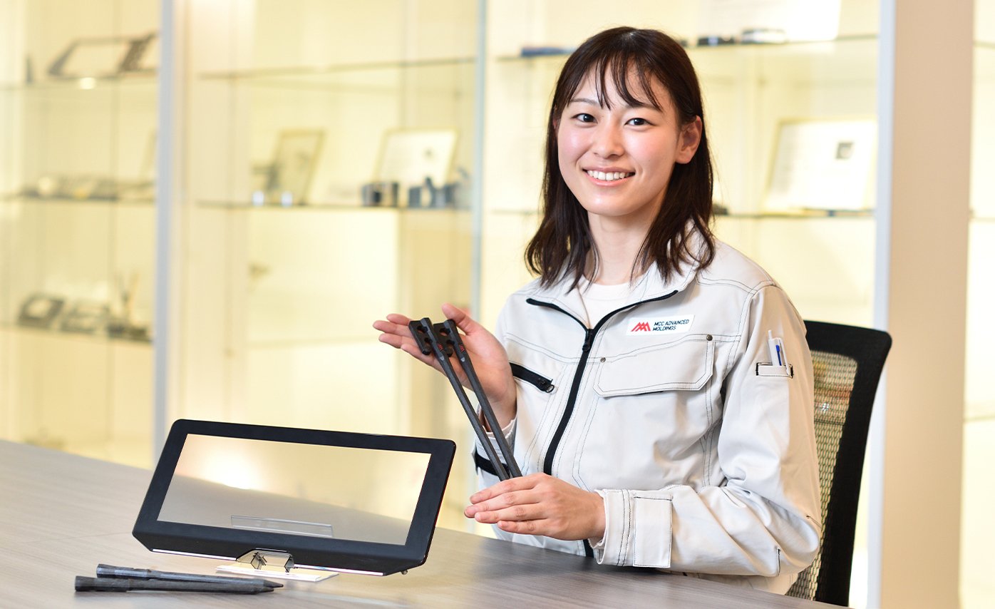 樹脂加工製品の製造・開発をする会社で、自動車のディスプレイ部品や内装部品などの企画営業をしています。ゼロから製品を作るので、製品の仕様が決まるまでにはお客さま・自社ともに複数部署の担当者が関わります。コスト面や技術面など、調整が難しい時もありますが、自分が会社の窓口として関わってきた製品が実際に使われると思うと励みになります。