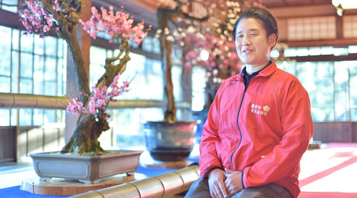 梅の鉢植え「盆梅」の専門員として、「長浜盆梅展」という展示会運営や盆梅の管理・育成業務を行っています。樹齢400年と伝わる古木など、多くの貴重な盆梅を扱うので、未だに毎年花を咲かせてくれた時にはほっとした気持ちになります。