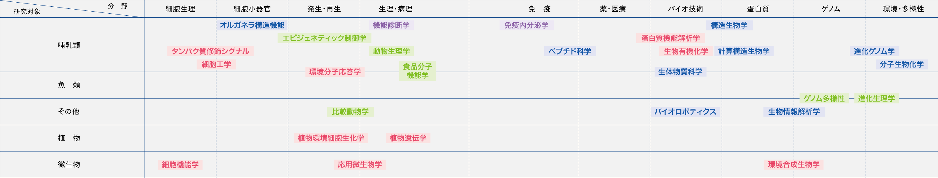 TOP 教育 研究室一覧 研究室一覧 各研究室の研究領域 フロンティアバイオサイエンス学科 フロンティアバイオサイエンス学科臨床検査学コース バイオデータサイエンス学科 アニマルバイオサイエンス学科 フロンティアバイオサイエンス学科 細胞機能学研究室 担当教員:岩本(木原) 昌子 タンパク質修飾シグナル研究室 担当教員:亀村 和生 生物有機化学研究室 担当教員:河合 靖 蛋白質機能解析学研究室 担当教員:長谷川 慎 植物環境細胞生化学研究室 担当教員:林 誠 応用微生物学研究室 担当教員:向 由起夫 環境分子応答学研究室 担当教員:池内 俊貴 環境合成生物学研究室 担当教員:石川 聖人 植物遺伝学研究室 担当教員:今村(陣田) 綾 細胞工学研究室 担当教員:小宮 徹 フロンティアバイオサイエンス学科臨床検査学コース 機能診断学研究室 担当教員:山本 哲志 免疫内分泌学研究室 担当教員:小川 秀一郎 バイオデータサイエンス学科 進化ゲノム学研究室 担当教員:大島 一彦 生物情報解析学研究室 担当教員:塩生 真史 バイオロボティクス研究室 担当教員:清水 正宏 構造生物学研究室 担当教員:白井 剛 分子生物化学研究室 担当教員:中村 卓 生体物質科学研究室 担当教員:堀部 智久 ペプチド科学研究室 担当教員:向井 秀仁 オルガネラ構造機能研究室 担当教員:奈良 篤樹 計算構造生物学研究室 担当教員:依田 隆夫 アニマルバイオサイエンス学科 ゲノム多様性研究室 担当教員:小倉 淳 食品分子機能学研究室 担当教員:河内 浩行 エピジェネティック制御学研究室 担当教員:中村 肇伸 動物生理学研究室 担当教員:永井 信夫 進化生理学研究室 担当教員:齋藤 茂 比較動物学研究室 担当教員:和田 修一