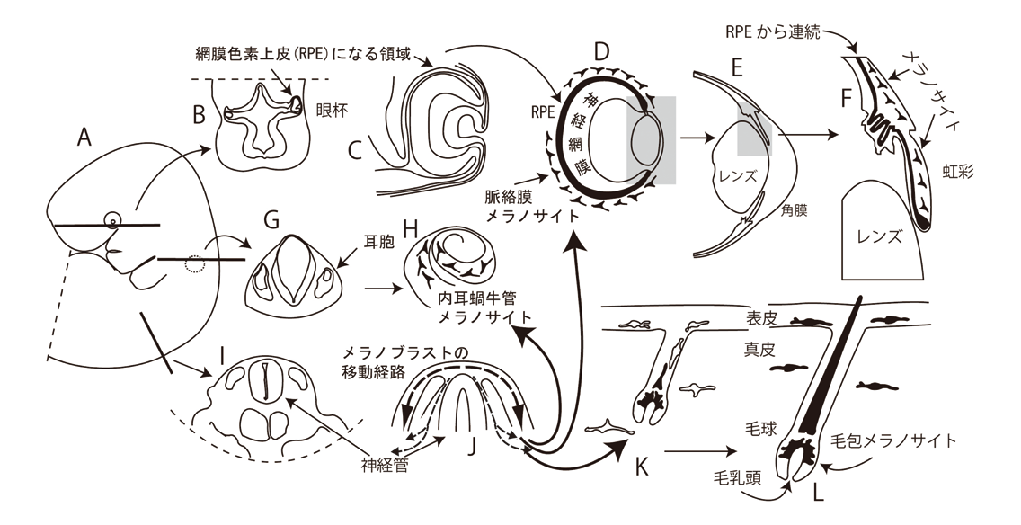 図2:哺乳動物の色素細胞系譜: Mammalian pigment cell lineages発生中の脳に形成される眼杯からは網膜色素上皮(RPE)が分化する。胚の背側に形成される脊椎動物特異的な神経冠(堤)に由来するメラニン色素細胞(メラノサイト)の前駆細胞(メラノブラスト)が、耳胞の領域を含め全身に移動する様子を示す。