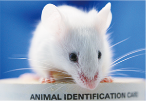図3:黒眼白毛色マウス突然変異体(Mitf mi-bw/Mitf mi-bw): A black-eyed white mouse mutant このマウスは網膜色素上皮は正常に発生するので黒眼となるが、脊椎動物特的な神経冠(堤)由来の色素細胞が発生できず、白毛色で難聴を示す。