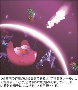 がんの化学療法では、がん細胞の特性を決める蛋白質や遺伝子の機能を抗がん剤でコントロールすることで治療に結びつけている。お薬が直接作用する分子は作用点と呼ばれる。その解明は、分子標的治療の基礎となる重要な研究テーマである。われわれは、興味深い生理活性を持つ抗がん剤候補物質の作用点(レセプター分子)を明らかにし、そこに作用する分子を探し出すことで、新しい薬剤の創出につなげたいと考えている。現在までに、数種類の低分子量化合物の作用点を明らかにし、誘導体を合成してより標的に作用しやすい化合物を作り出している。(詳しくは業績論文1,5を参照)