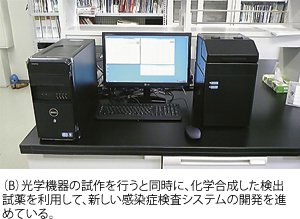 近年、たったひとつの分子から発せられる蛍光を測定することで様々な情報を得る一分子蛍光分析と呼ばれる技術が発展している。このような原理を病原体の検出に応用し、ウイルスやバクテリア、あるいはそれらと関係した病原因子を高感度・迅速に検出するための検出機器の開発を進めている。(詳しくは業績論文2を参照)