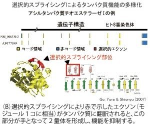 ヒトのcDNAの網羅的な解析が進み、選択的スプライシングの実態が姿を現してきた。選択的スプライシングはひとつの遺伝子から多種類のタンパク質を生む分子機構と考えられ、イントロンの役割が、ここに位置づけられる。真核生物はイントロンをもつが、原核生物は例外を除けば、イントロンをもたない。従って、選択的スプライシングは真核生物の特色である。選択的スプライシングにより、タンパク質機能を調節している例(アシルタンパク質チオエステラーゼI)を図Bに示す。