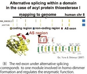 Extensive analysis of human cDNA reveals the functional role of various alternative splicing (AS). Alternative splicing is a mechanism to produce various proteins from a single gene and this is an important role of introns exiting in eukaryotic genomes. An example of AS regulating the enzymatic function is shown for acyl protein thioesterase I (Fig.(B)).