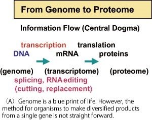 Genomic information of various species is accumulating with high speed. Translation of genomic information to proteins is not straight-forward, and there are unexpectedly complex steps to produce various kinds of proteins from a single gene (alternative splicing ) and translation to a protein after conversion of a single base of mRNA to different kind of base (RNA editing ). We analyze these biological strategies to produce diversity and aim to contribute for development of bio-technology.