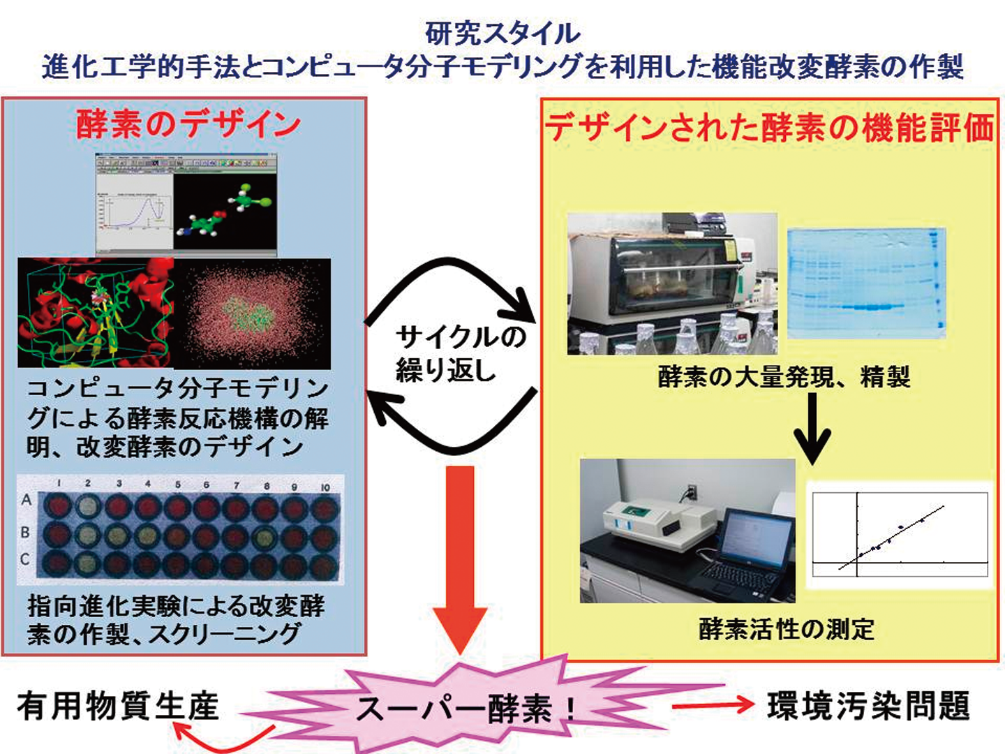 コンピュータ分子モデリングによる分子レベルでの酵素反応機構解析とその知見を利用した改変酵素のデザインと作製、あるいは進化工学的手法による改変酵素の作製を通して環境汚染物質の分解や産業的に有用な物質の生産に貢献したいと考えている。 現在は、以下の3つの酵素について研究を行っている。
