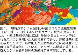 ゲノム配列の連続塩基(オリゴヌクレオチド)組成には、各生物のサインと呼べるような明瞭な特徴が存在するが、kbレベルに断片化してもその特徴を検出できるBLSOMと呼ぶ新手法を確立した。G+C%としてゲノムを特徴付けていた一変数を、多変数(4連塩基組成では256の変数)へ拡張した解析である。現時点でゲノムが解読された全生物種の配列を一枚のマップ上に表示し(図1)、ゲノム配列の生物系統別での特徴の検出を可能にする。このマップ用いれば、多数の未知生物のゲノム断片を解読するメタゲノム解析で得られた膨大な配列の系統推定が可能となる(論文3)。進化速度の速いインフルエンザウイルスのゲノム配列にBLSOMを適用すると、限定された範囲ではあるが、ゲノム配列の変化方向を予測可能なことも明らかにした(論文2,4)。ヒトゲノム配列の5連塩基組成を解析することで、セントロメア近傍のヘテロクロマチン領域に転写因子の結合配列が顕著に集中して存在することも見出した(論文1)。
