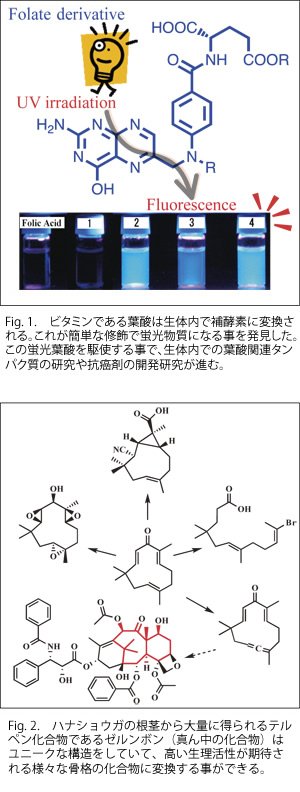 天然に存在している低分子化合物は生体内で様々な機能を発揮している。これらを化学的に変換する事で、より高機能な分子を作り出す事ができる。例えば、ビタミンを蛍光物質に変えたり(Fig. 1)、テルペン化合物から様々な生理活性化合物を合成してきた(Fig. 2)。