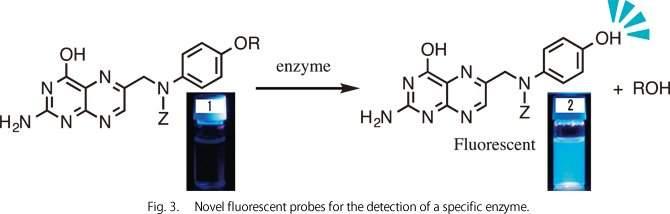具体的には、ビタミンである葉酸は蛍光を発しないが、誘導体化する事で蛍光を発する物質になる事を見いだした。この変化をうまく利用し、分子設計する事で新しい酵素活性検出蛍光プローブを幾つか開発してきた(Fig. 3)。