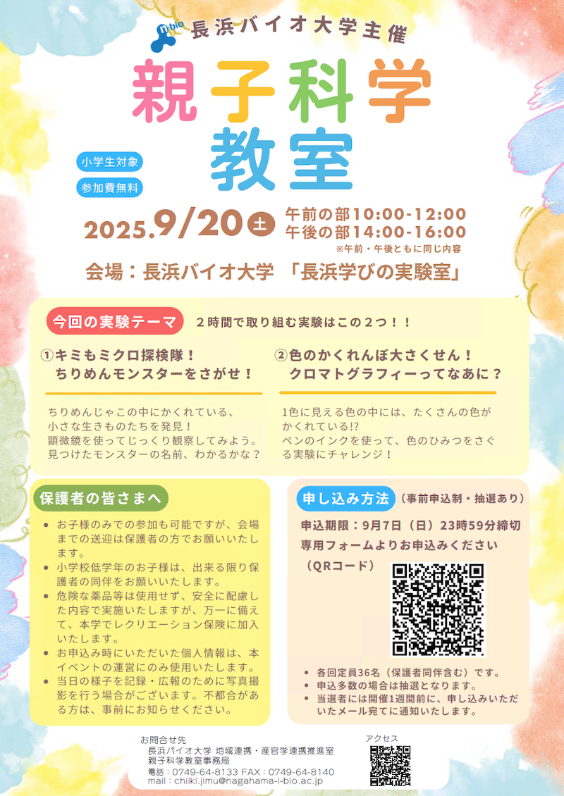 イベント 受付終了【参加者募集】親子で楽しむ!長浜バイオ大学「親子科学教室」(9/20開催)