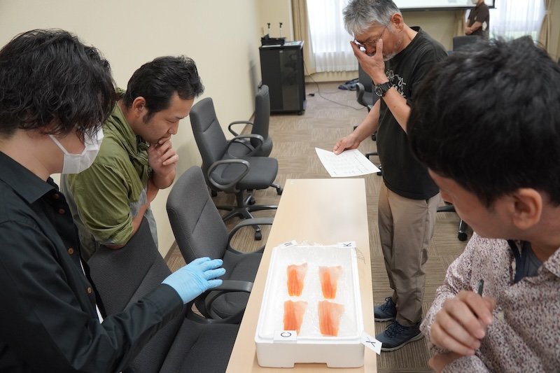 今回の試験では、学内関係者だけでなく、養殖現場で活躍する生産者の川瀬さん(鮎茶屋)や、鶴岡市立加茂水族館の館長の奥泉さんなど、学外の専門家も参加。試食後には、ビワマスの品質や味わい、今後の可能性について活発な意見交換が行われ、会場は熱気に包まれました。