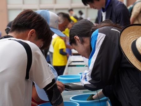 調査後は高時小学校に戻り、採取した生き物を、応援に来てくれた本学卒業生の環境調査員と水族館職員が分類・カウント。昨年との違いを確認しながら、生態系について理解を深めました。さらに、調査のために一時的に保護されていたオオサンショウウオと当日の調査で発見されたオオサンショウウオの2匹を観察し、個体識別の方法や調査手法、生態について学ぶ貴重な機会となりました。