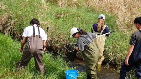 県内外から集まった25名の高校生が参加し、宇佐美教授、奈良准教授、和田准教授をはじめ、大学院生のティーチングアシスタント(TA)とともに研究体験に取り組みました。会場となった大学の研究施設では、電子顕微鏡を用いた観察や遺伝子組み換え実験、水生生物の調査など、多彩なプログラムを実施。参加者は仲間と協力しながら、仮説の検証からデータ解析、成果発表までを行い、研究活動の一連の流れを体験しました。