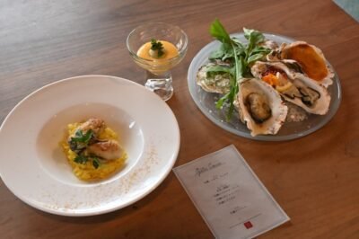 発表会には浅見市長をはじめ、多くの報道関係者が訪れ、関心の高さが伺えました。試食会では、CLUB MAISONによる料理のコンセプト紹介の後、カキを使った前菜やリゾットなどが提供され、来場者からも好評を博しました。