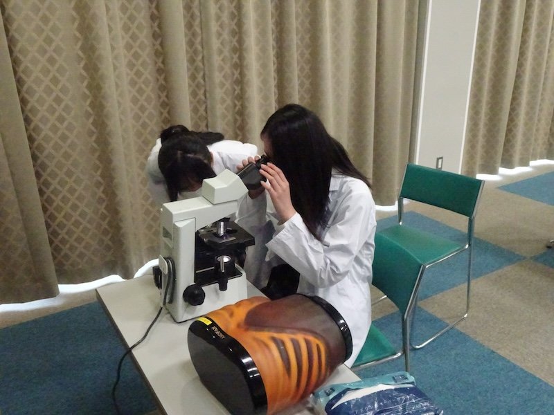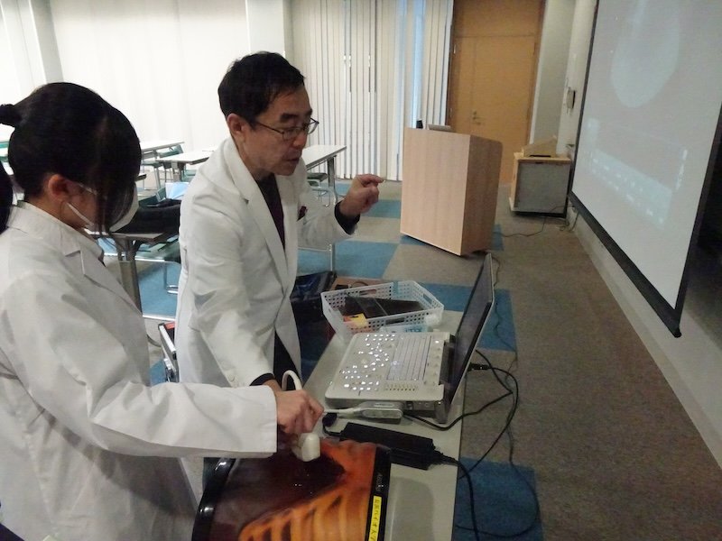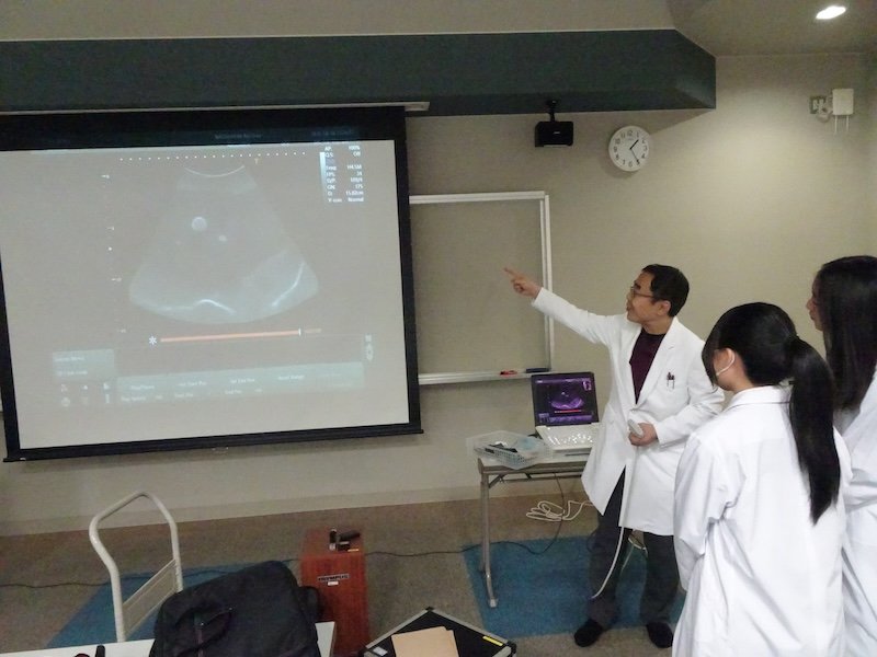 授業後半では、大学で実際に使用されている超音波(エコー)検査装置や顕微鏡を用いた体験型プログラムを実施。医療現場さながらの機器に触れながら、観察や操作を行うことで、臨床検査学の学びが「知識」だけでなく「実践」に根ざしたものであることを体感してもらいました。