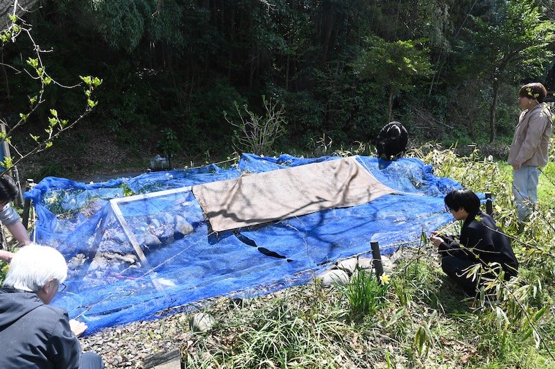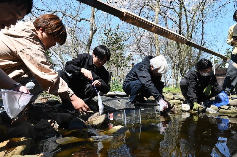 2026年4月3日(金)、長浜市田村山において、長浜バイオ大学アニマルバイオサイエンス学科の教員および大学院生を中心に、ヤマトサンショウウオの卵を旧保護池から新保護池へ移動する作業を実施しました。この日は計39卵塊を移動し、計算上では約3,000匹もの幼生が誕生する見込みです。