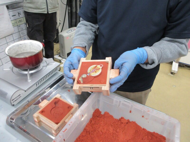 3年生の生産管理システムという講義のご縁で、3年次生のSさんが本学近くの扶桑工業株式会社様の工場見学会に参加しました。 扶桑工業株式会社様はいろいろな会社の機械部品を作っておられますが、講義の中の金属加工のところで紹介された鋳造体験の一環として、ひこにゃんメダルを作製(彦根市から認可済み)してきました。とても真剣に見学と体験に取組んでくれたようで扶桑工業株式会社様からもお褒めの言葉をいただきました!