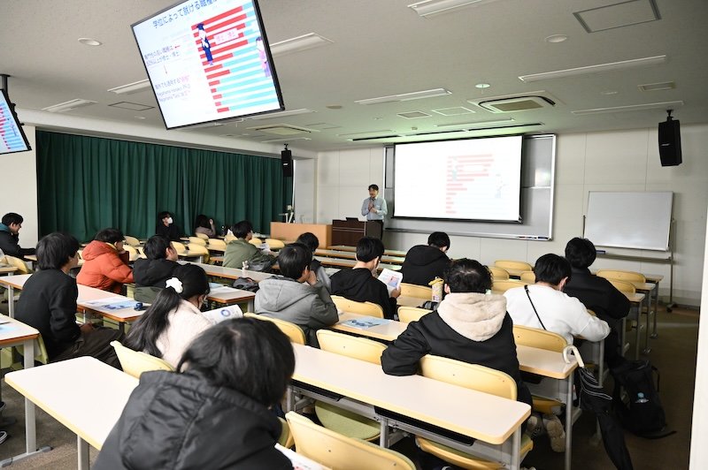 白井 剛研究科長からは、将来の就職先を考えたときに、専門性の高い職種では半数以上が大学院修了者で占められており、本学修了生の約4割も研究・開発職で活躍している現状を解説。また、学部卒と大学院修了者の生涯賃金に関するデータも紹介され、進学が長期的な経済的メリットをもたらす可能性が示されました。学費等の懸念に対しては、内部進学者の入学金免除や奨学金、TA制度などを活用することで、国立大学並みの負担額で修了が可能になる手厚い支援体制について説明がありました。