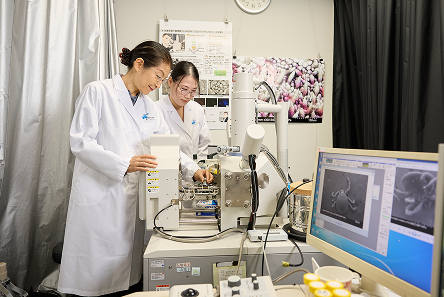 光の代わりに波長の短い電子線を利用して、生物や物質の表面を超高倍率で観察・撮影。低真空状態で乾燥した生物試料も観察できるほか、電子線照射によって発生する特性X線の検出し、元素分析や組成分析も可能です。