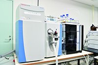 最新のイオントラップ型質量分析計で、高いイオン選択性と感度、質量分解能を有しています。これまで同定できなかった微量物質や、さまざまな物質が混ざった試料から未知の物質を同定することも可能となりました。